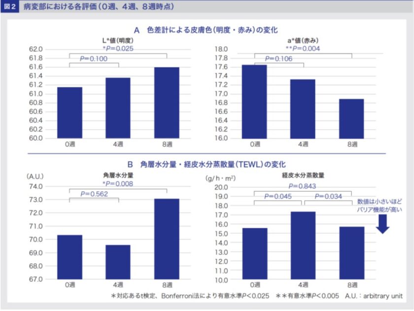 4週・8週のいずれでも、皮膚科専門医の評価で有意に赤みが減少しました。