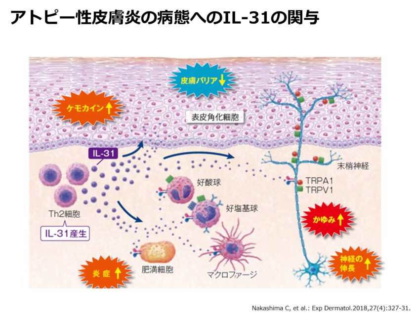 アトピー性皮膚炎は、皮膚のバリア機能の低下と慢性的な炎症が原因で、 強いかゆみに悩まされることが多い疾患です。 その「かゆみ」を引き起こす主な原因のひとつが、IL-31(アイエル31)という炎症性サイトカインです。 ミチーガはこのIL-31の働きをブロックすることで、かゆみを根本から抑え、皮膚炎の悪循環を改善します。 治療は2週間に1回の皮下注射で行い、医師が状態を確認しながら安全に実施します。 外用薬(ステロイド・タクロリムスなど)や保湿治療と併用することで、 より高い治療効果が期待できます。 臨床試験では、かゆみ・炎症の軽減だけでなく、睡眠の質や生活の質(QOL)の改善も報告されています。